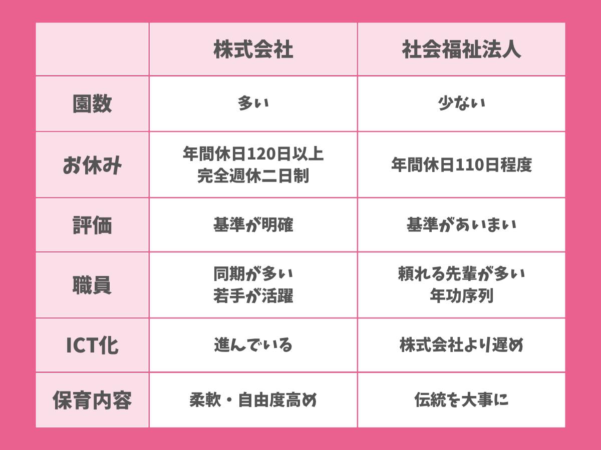 株式会社は社会福祉法人と比べ、こどもや保護者、保育士のニーズに合わせて様々な新しいサービス、働き方を導入しています。自分に合う働き方はどういう働き方か、園の雰囲気はどんな感じなのか、よく調べて、実際に見て、就活をしていきましょう!分からないことがあればLINEで質問してくださいね!