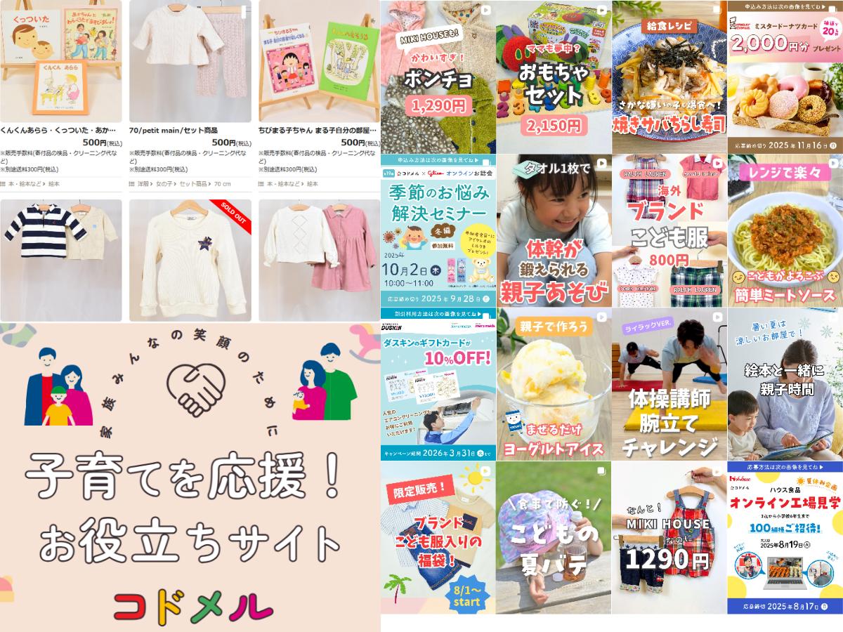 当社が運営する「コドメル」では使用しなくなった子供服やおもちゃなど、リユース品をお得に受け取るサービスも提供しています。「大切に使ってきたからこそ、誰かにまた使ってほしい…」そんなママ・パパたちの声からコドメルは生まれました。そして「家族みんなの笑顔のために」をコンセプトに当社の保育園・学童クラブ・児童館だけでなく、株式会社ダスキンや株式会社三井住友銀行など、多くの企業さまにも賛同していただき寄付品を多くのご家庭に届けています。