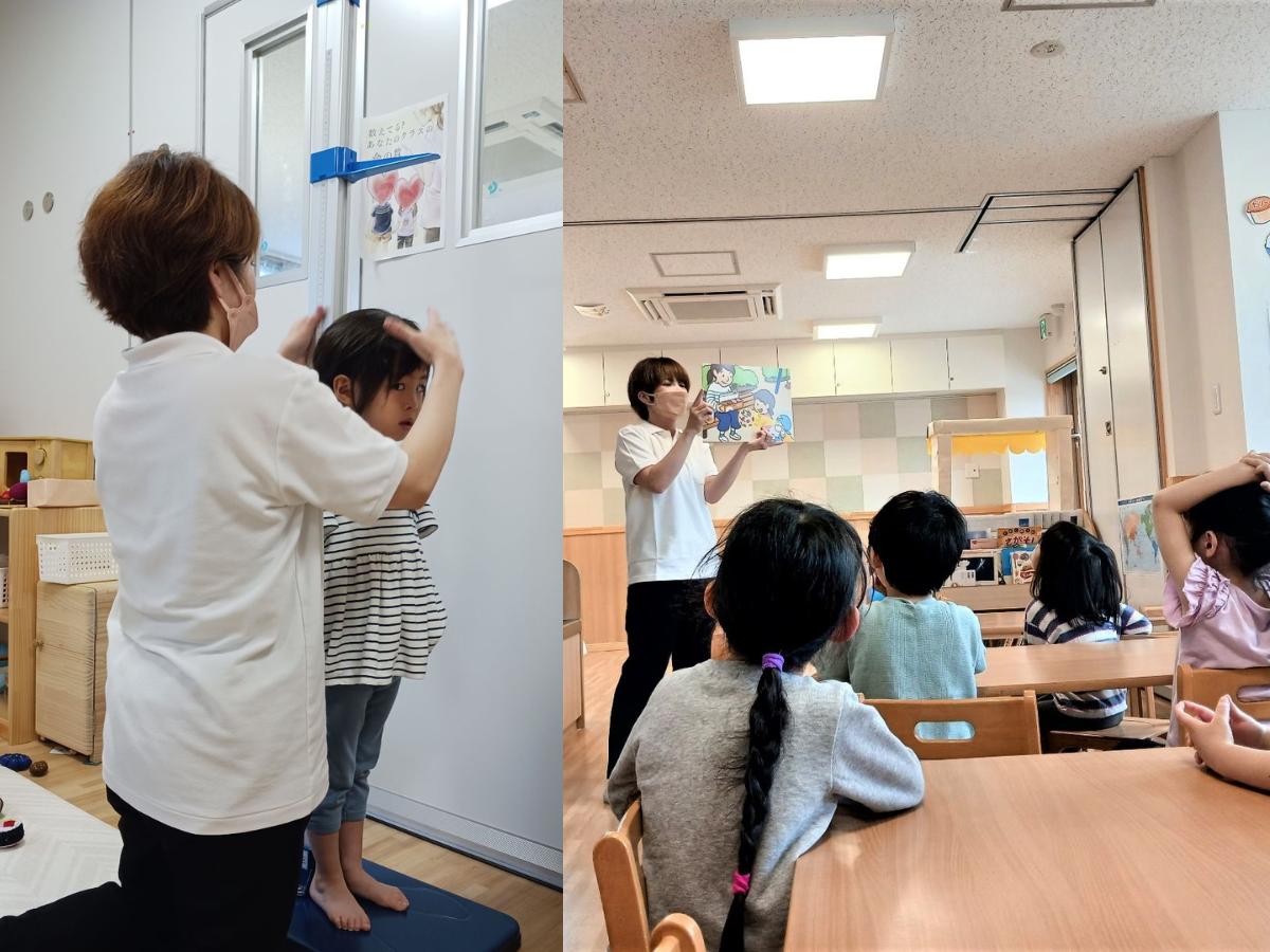 日によって、0歳児保育補助、身体測定(月1回)、保健指導、各種検診の補助等をおこないます。保健指導は、会社で定められた保健指導計画に基づいて「手洗い・うがい指導」や「歯みがき指導」、「熱中症予防」など、こどもたちに向けて紙芝居などを用いてわかりやすく伝えます。また、保護者や職員に向けて指導や研修を行うこともあります。