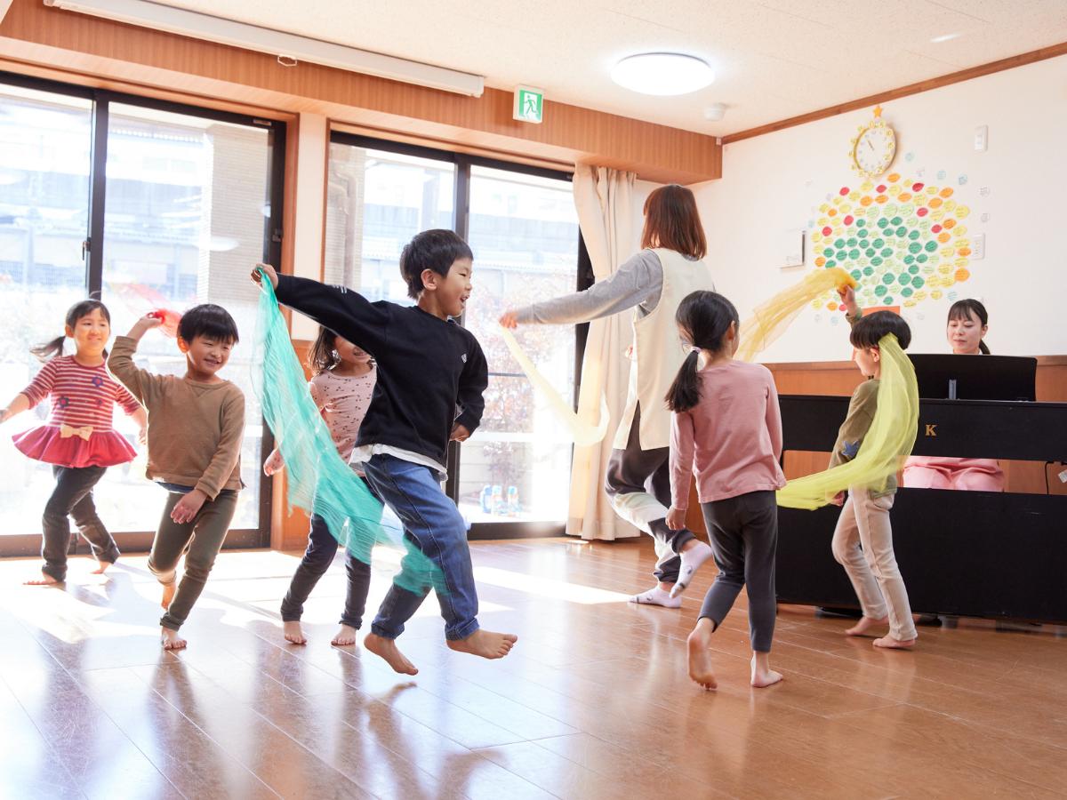 こどもたち同士での運動あそびを行う中で、試行錯誤を繰り返し得た多くの成功体験から、意欲的なこころを育てるとともに社会性(思いやり、仲間と協力する大切さ、応援する心)を養っています。