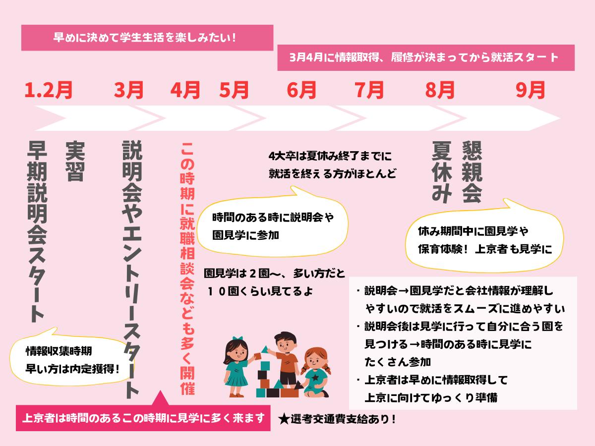 秋学期までに内定獲得したい場合は、夏休み期間の動きが重要になってきます!空いている1日で複数園見学したり、保育体験をしたり、納得できる園を決めるて選考申し込みができるようにしていきましょう。特に上京を希望している方は、長期休み中に首都圏の見学にお越しください。交通費支給ありで、1日に2~3園の見学と本部見学がセットになったツアーも開催しています。
