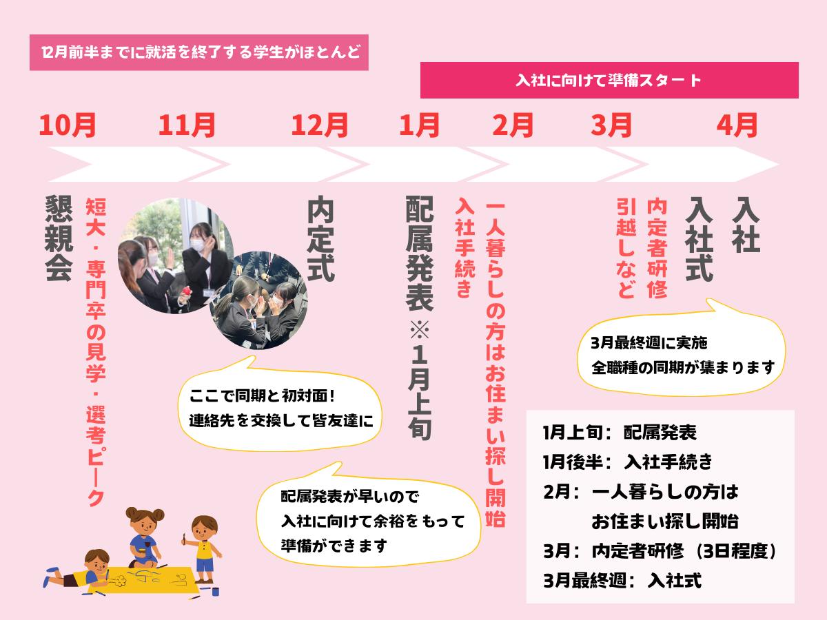 就職活動は早期化しているため、早い時期から動き出せば理想通りの就活を進めることにつながります!早めに内定獲得したい方はこの時期から説明会参加をしたり、情報収集をしていきましょう。日本保育サービスでも早期エントリー、説明会の予約を開始しています。