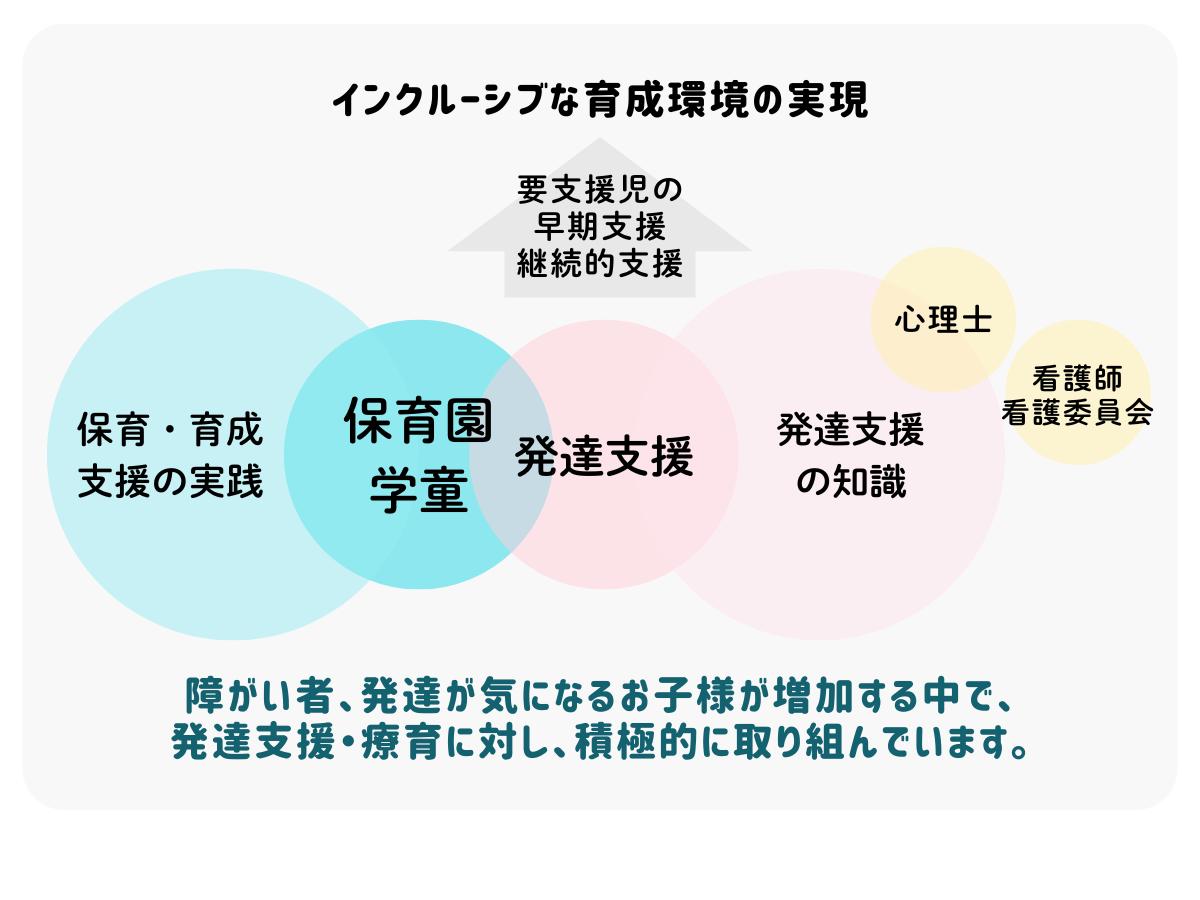 すべてのこどもたちが「未来(あす)を生きる力を培い」、これからの社会が、どんなに変化して予測困難な時代になっても、自ら課題を見付け、自ら学び、自ら考え、判断して行動し、それぞれに思い描く幸せを実現してほしいと願っています。個性など一人一人の違いを尊重し、障がい者がそのもてる能力を最大限度まで発達させ、障がいのある者と障がいのない者が共に学ぶインクルーシブ保育を大切にしています。